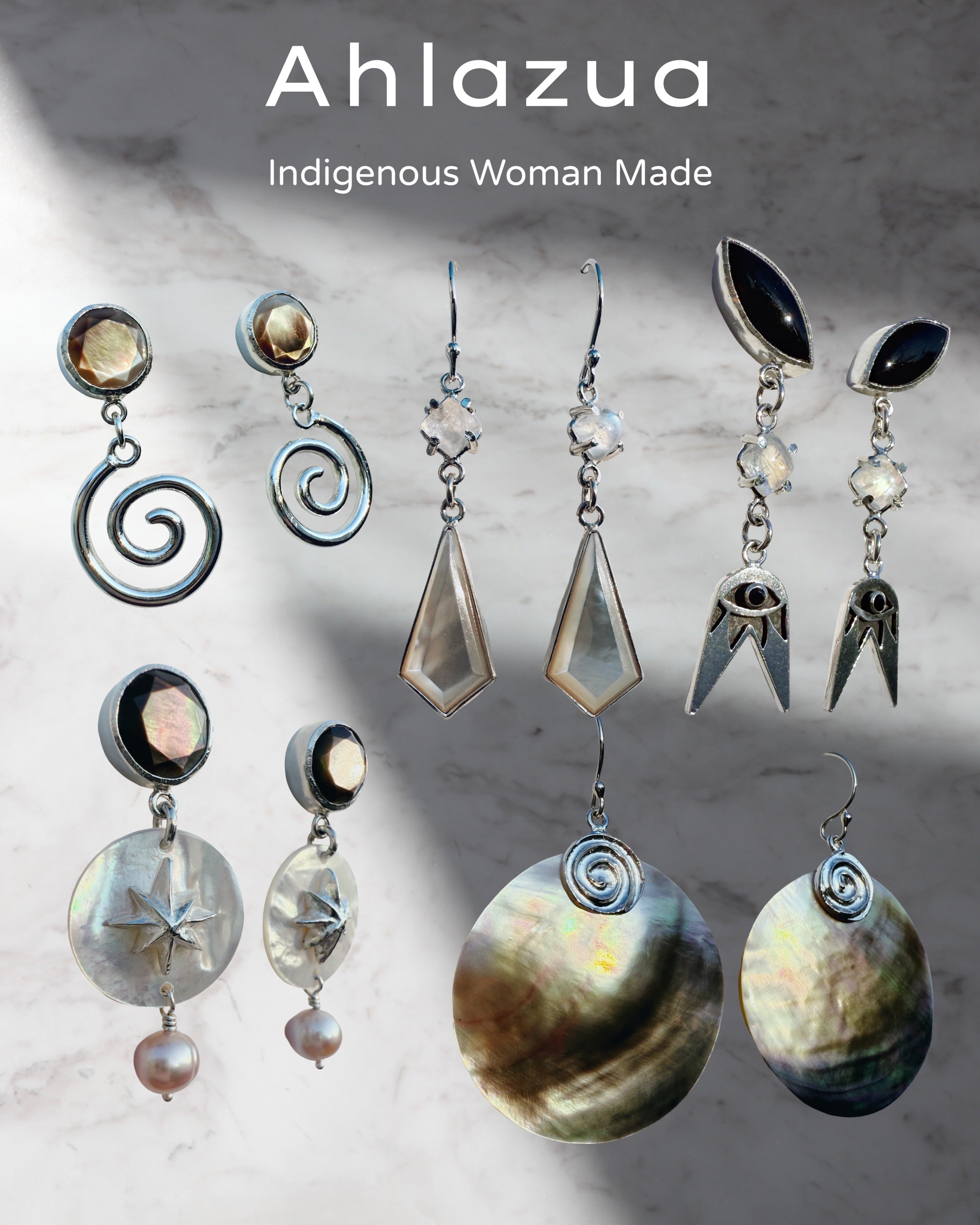 Ahlazua represents Ancestral knowledge attained from the Southeastern Woodlands (Mvskoke Creek-Euchee/ Choctaw) and the Southwestern Deserts (Diné). "These Hand Fabricated works are made with Materials & Techniques that have been used in my Tribes for countless Generations." Materials used to tell stories of trade routes and specific geographic materials important to our people.