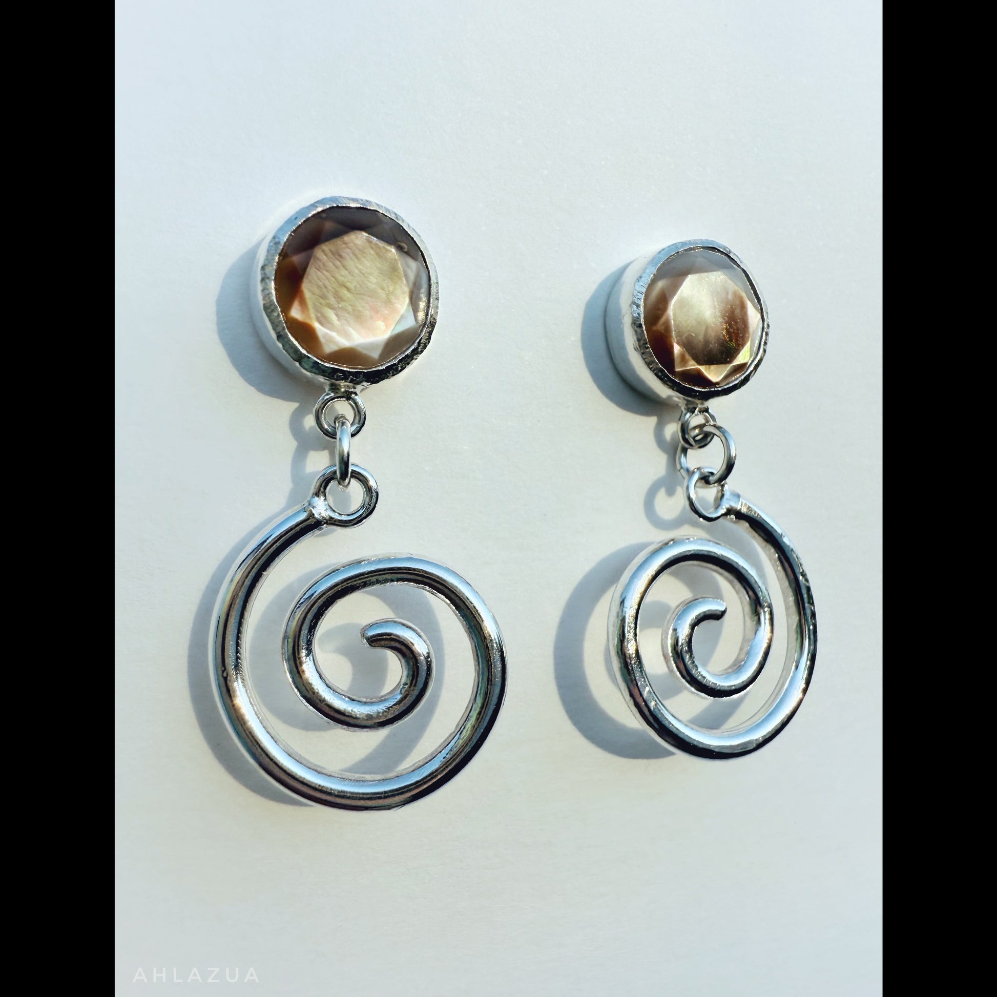 Faceted Black Mother of Pearl posts with Spiral detail all in Sterling Silver.